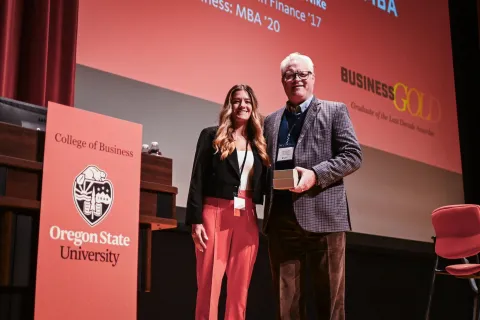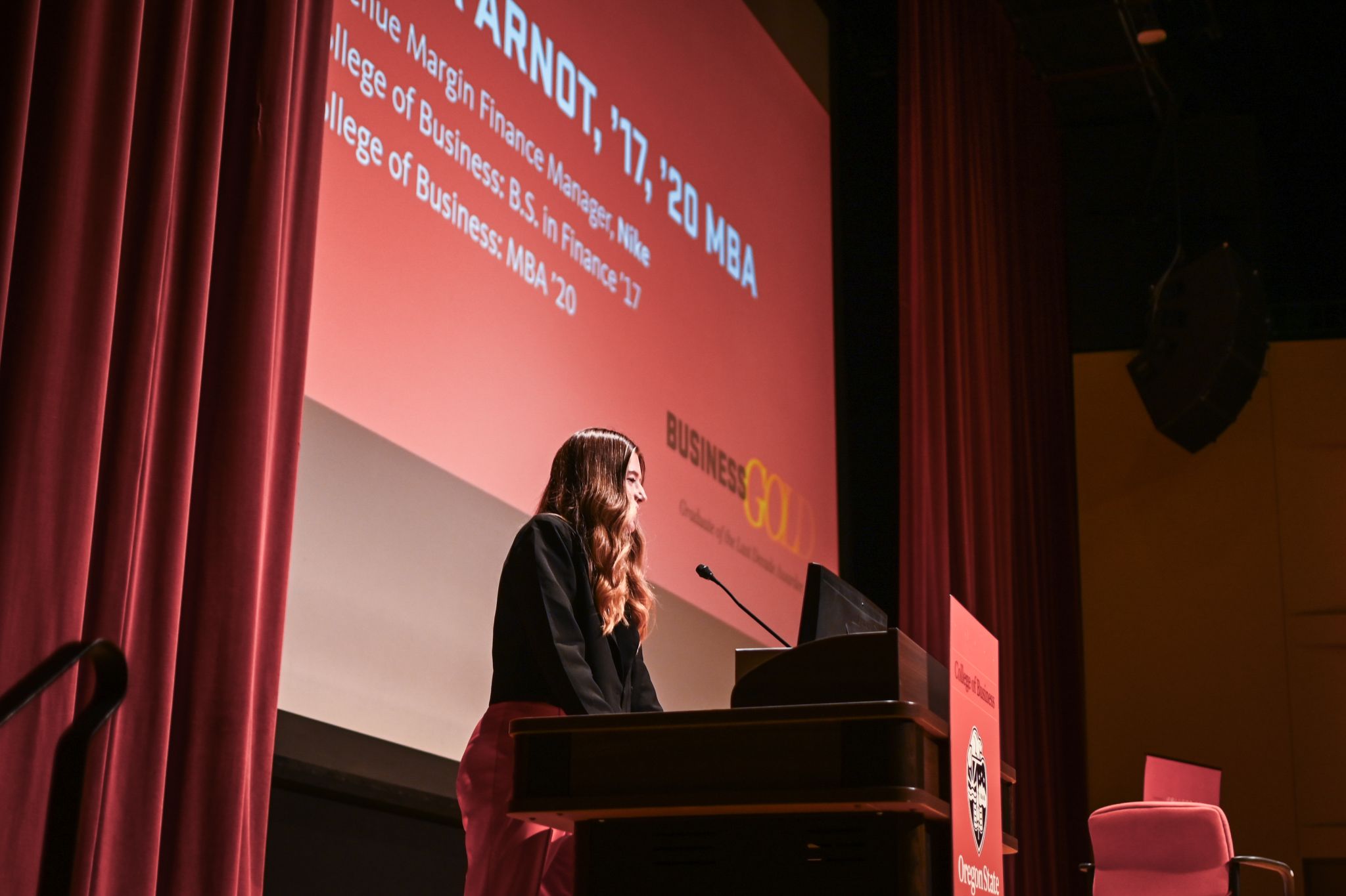 Before the event, College of Business Dean Tim Carroll asked Arnot if she would be comfortable receiving her award for the Distinguished Graduate of the Last Decade (GOLD) so publicly.