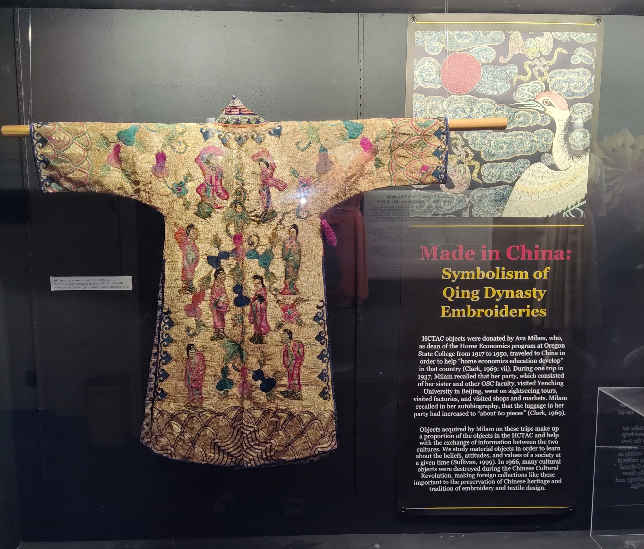 Objects were donated to the HCTAC by Ava Milam, who, as dean of the Home Economics program at Oregon State College from 1917 to 1950, traveled to China in order to help “home economics education develop” in that country (Milam, 1969: vii). During one trip in 1937, Milam recalled that her party, which consisted of family and other OSC faculty, visited students and faculty at Yenching University, went on sightseeing tours, visited factories, and visited shops and markets. In her autobiography, Milam even noted that the number of luggage in their party, which included her sister and other Home Economics faculty, had increased to “about 60 pieces” (Clark, 1969: 217).